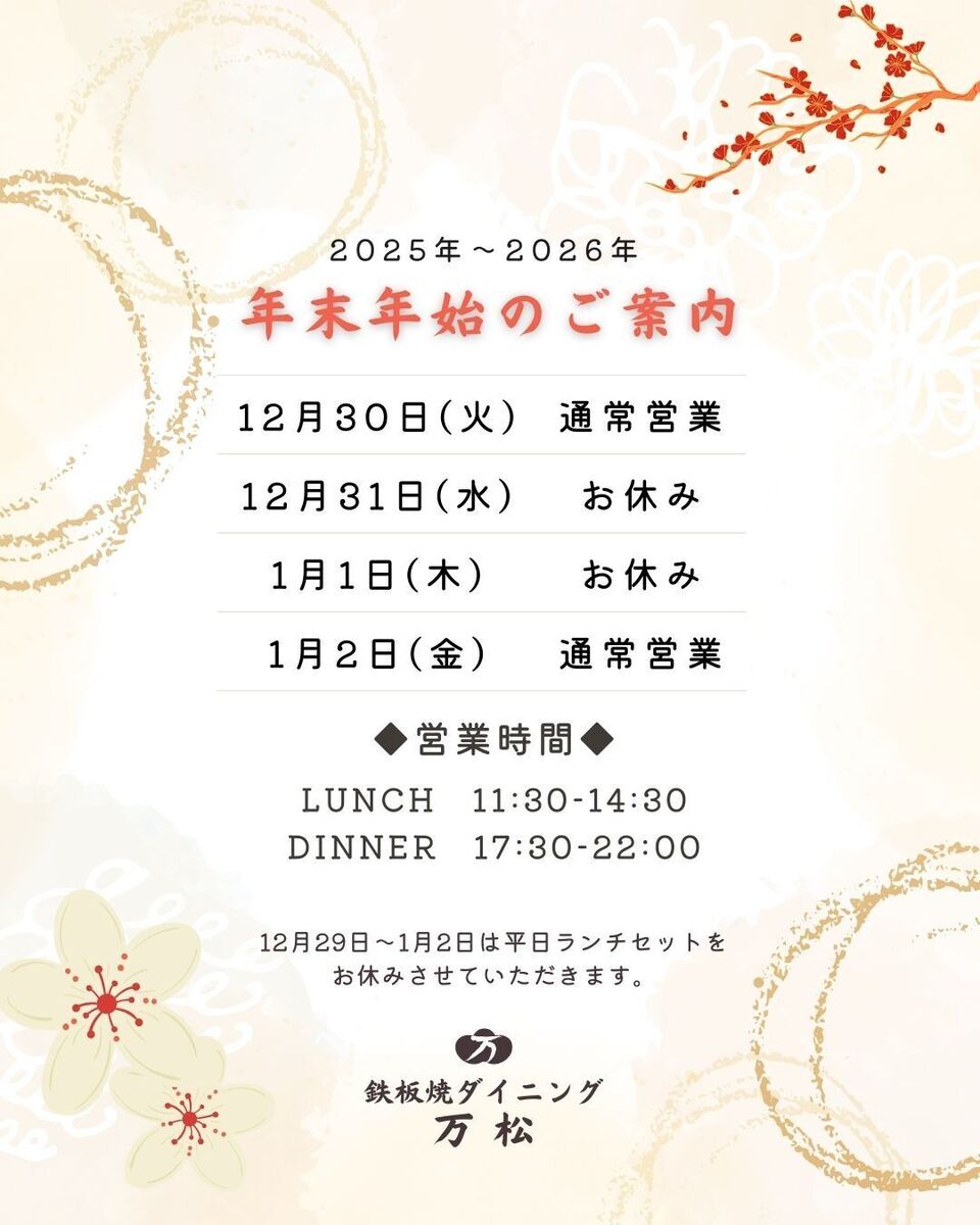 年内は12月30日まで、年始は1月2日からランチタイム、ディナータイムともに営業いたします!